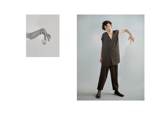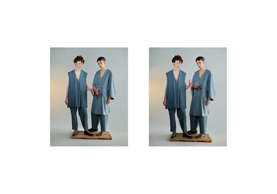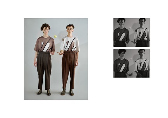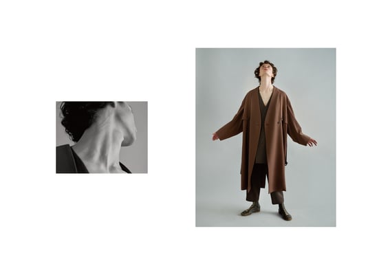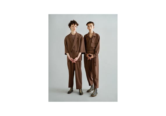 Rust (internal essence), ambiguity, harmony, beauty that decays as it is, movement that is born from stillness, etc. I feel that I want to look locally and find value in that spirit and sense because it is a world that creates uniform senses and values worldwide through globalization due to the development of science. The theme of "wabi-sabi", which is the same as the previous season, is not the meaning of kimono, but the collection focuses on the spirit and aesthetics that Japanese people have had for a long time. Instead of thinking about adding design, feel the internal essence (unconscious element) and create the form and shape of the material. For materials with high drape, pleats and tacks are taken to give movement, and for materials with elasticity, a three-dimensional form is created. In addition, we continue to keep in mind the inevitable design from the idea of respecting what it is, which is the consciousness of "wabi-sabi". From the desire to accept decaying things, we made materials in anticipation of aging, and focused on delicate and elegant expressions and textures without feeling the texture of new products. Regarding the color palette, we extracted it from the ambiguous colors that exist in nature, not the colors that consist of the general three primary colors like the colors in various traditional Japanese colors. I think it is a color that is in harmony with the world and people. In addition, as a new focus element this season, I am aware that I can feel the charm by creating a sense of discomfort due to "missing" and "removing", which are not the beauty of the completed royal road but the beauty of wabi-sabi. .. Furthermore, from the very Japanese way of thinking of "ma", we are cutting with an awareness of the space between the body and the cloth. We believe that the more space there is, the more the original movement and expression of the material will be created.